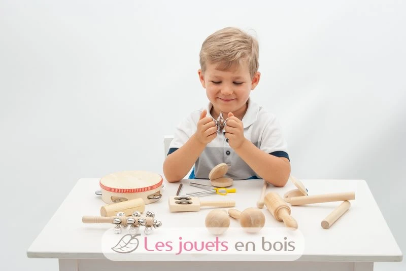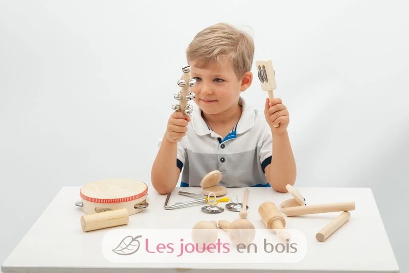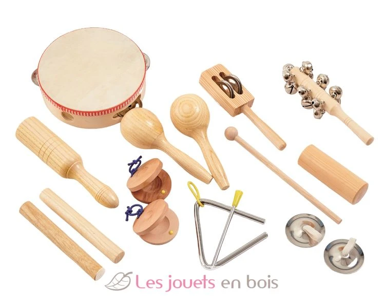 Enthält 2 hölzerne Maracas, 2 hölzerne Kastagnetten, ein hölzernes Tamburin, ein Metalldreieck und einen Schlägel, 2 hölzerne Claves, einen hölzernen Rhythmus-Klapper, eine einfarbige Guiro und einen Schlägel aus Holz, 2 Fingerbecken aus Metall, einen hölzernen Shaker-Topf und eine 13er Glocke Jingle-Stick aus Holz.