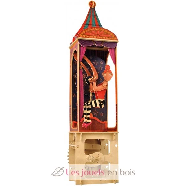Ein aus Holz zu montierender Automat, ohne Klebstoff oder Werkzeug, der beim Drehen der Kurbel lebendig wird!