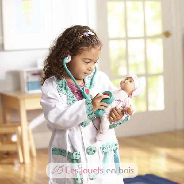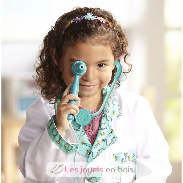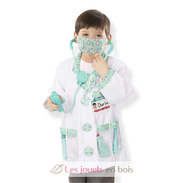 Enthält: eine Jacke, eine Maske, ein Thermometer, ein Stethoskop mit Soundeffekten, eine Spritze, ein Hammer zum Überprüfen der Reflexe, ein Otoskop und ein Etikett zum Schreiben Ihres Namens mit Bleistift.