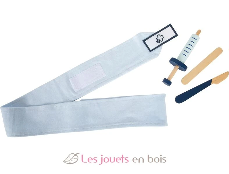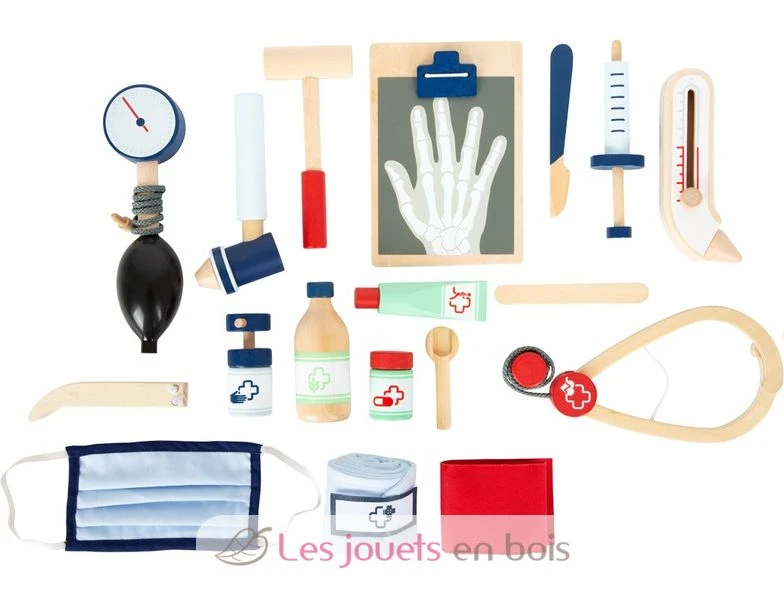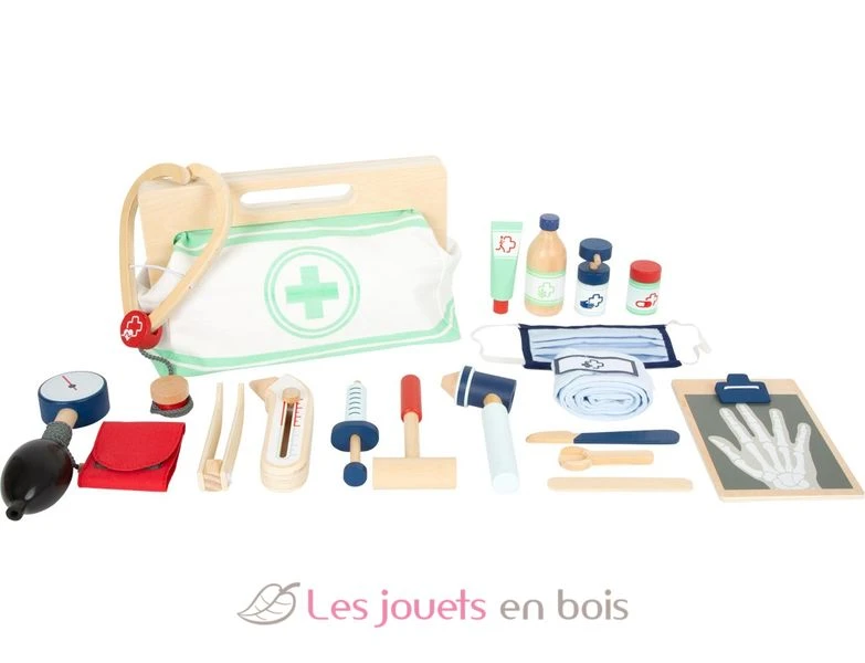 Mit dieser typischen Arzttasche sind kleine Mediziner perfekt ausgestattet! Die Tasche aus weichem Stoff überzeugt optisch und funktionell mit seinen kinderleicht zu öffnenden und durch Magnete sicher schließenden Griffen aus naturbelassenem Holz. Im Inneren der Medizinertasche findet sich alles, was zur Behandlung gebraucht wird: Stethoskop, Fieberthermometer, Spritze und vieles mehr aus robustem Holz! Highlights sind das Blutdruckmessgerät mit Pumpball und das Otoskop mit echtem Vergrößerungsglas.