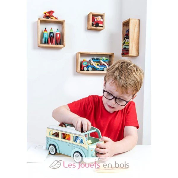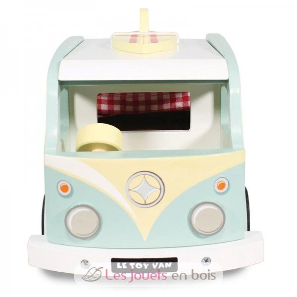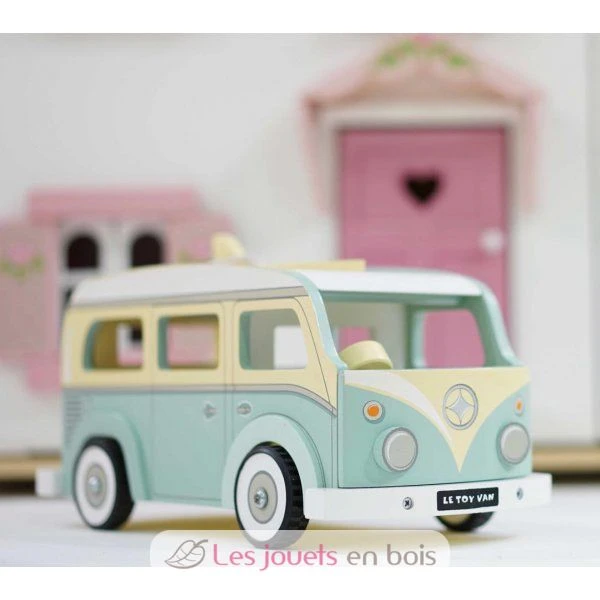 Entdecken Sie den Oldtimer-Campingwagen von Le Toy Van! Ein Holzfahrzeug für Kinder ab 3 Jahren, ein Surfer-Van, der Urlaubswünsche vermittelt! Dieses schöne Wohnmobil verfügt über ein abnehmbares Surfbrett. Während Sie das Dach heben, entdecken Sie ein Bett mit gepolsterter Matratze und eine Küchenzeile. Ihr Kind wird in der Lage sein, seine Lieblingscharaktere einzufangen und wird schöne Geschichten von Flucht und Urlaub erfinden.