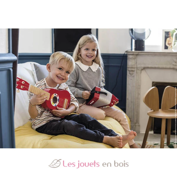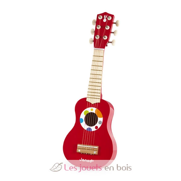 Die erste Holzgitarre für die ersten kindlichen musikalischen Versuche und… um Rockstar zu spielen !. Lassen Sie Ihrem Kind das Vergnügen der Musik entdecken. Diese Gitarre mit 6 metallsaiten wird Ihren jungen Musiker in die Freuden der Improvisation einführen.. Ein hübsches Knallrotes Musikinstrument mit bunten Punkten der Palette Konfetti hergestellt bei der Firma JANOD – Artikelnummer J07628.