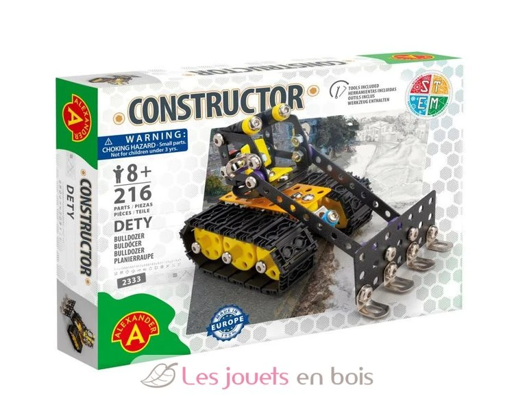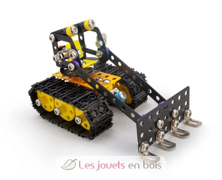 Ein Bausatz aus verchromtem Metall mit farbigen Kunststoffteilen, die mit Schrauben und Muttern zusammengebaut werden. 100% in Europa hergestellt. Ab 8 Jahren.