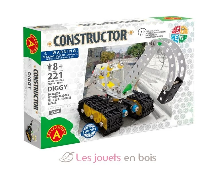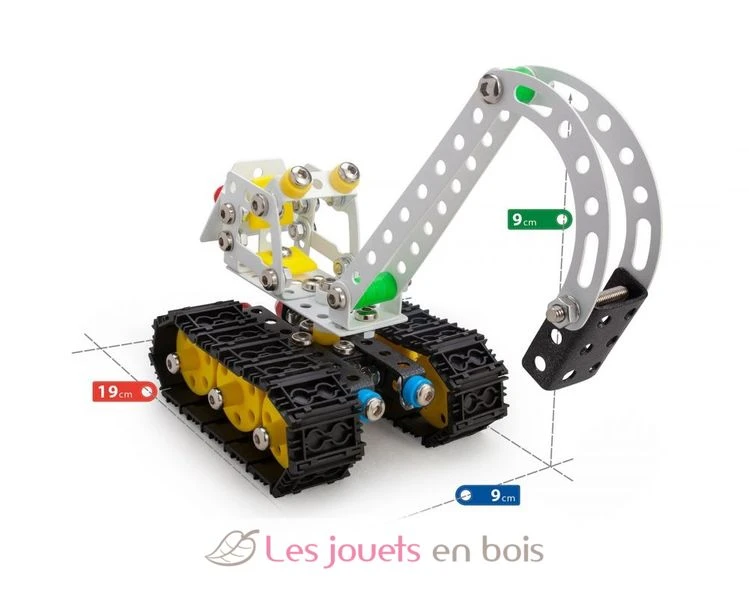 Ein Bausatz aus verchromtem Metall mit farbigen Kunststoffteilen, die mit Schrauben und Muttern zusammengebaut werden. 100% in Europa hergestellt. Ab 8 Jahren.