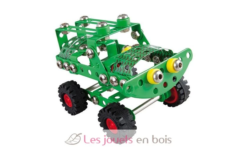 Ein Bausatz aus verchromtem Metall mit farbigen Kunststoffteilen, die mit Schrauben und Muttern zusammengebaut werden. 100% in Europa hergestellt. Ab 8 Jahren.