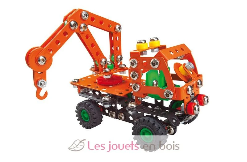 Ein Bausatz aus verchromtem Metall mit farbigen Kunststoffteilen, die mit Schrauben und Muttern zusammengebaut werden. 100% in Europa hergestellt. Ab 8 Jahren.