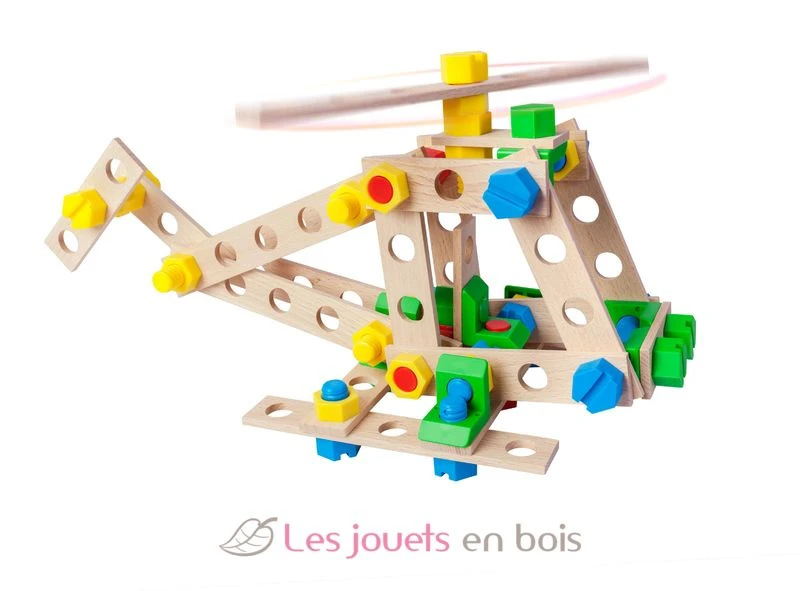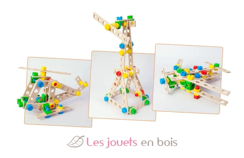 Ein Bauspiel aus Buchenholz. Die Montage erfolgt mittels Schrauben und Kunststoffmuttern massiv und farbig. 100% in Europa hergestellt. Ab 4 Jahren.