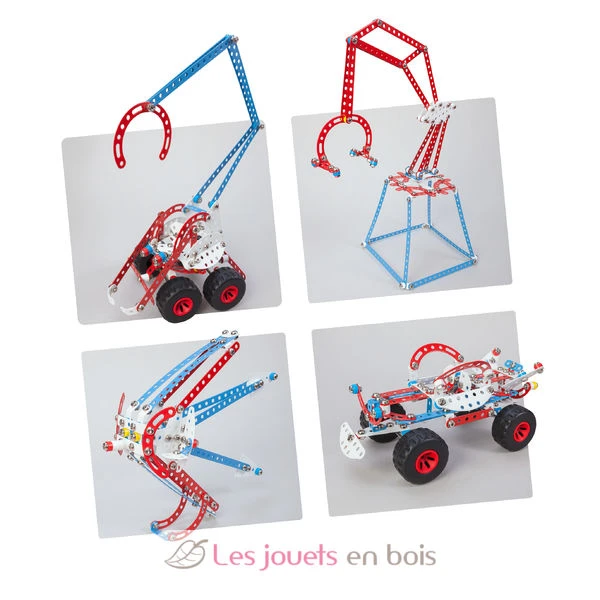 Ein Bausatz aus verchromtem Metall mit farbigen Kunststoffteilen, die mit Schrauben und Muttern zusammengebaut werden. 100% in Europa hergestellt. Ab 8 Jahren.