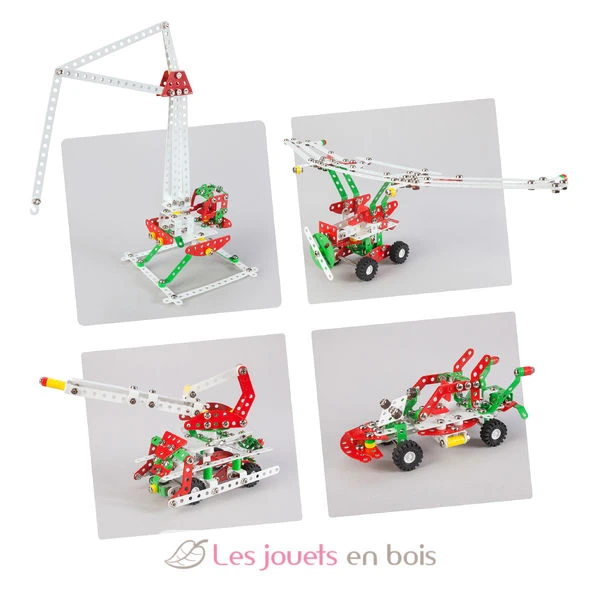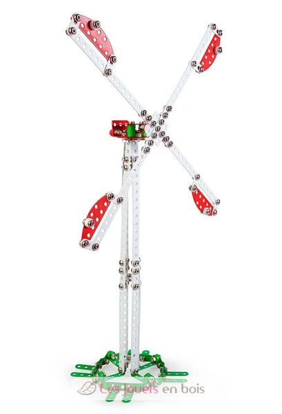 Ein Bausatz aus verchromtem Metall mit farbigen Kunststoffteilen, die mit Schrauben und Muttern zusammengebaut werden. 100% in Europa hergestellt. Ab 8 Jahren.