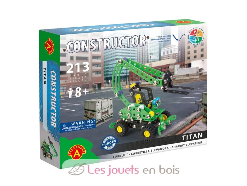 Ein Bausatz aus verchromtem Metall mit farbigen Kunststoffteilen, die mit Schrauben und Muttern zusammengebaut werden. 100% in Europa hergestellt. Ab 8 Jahren.