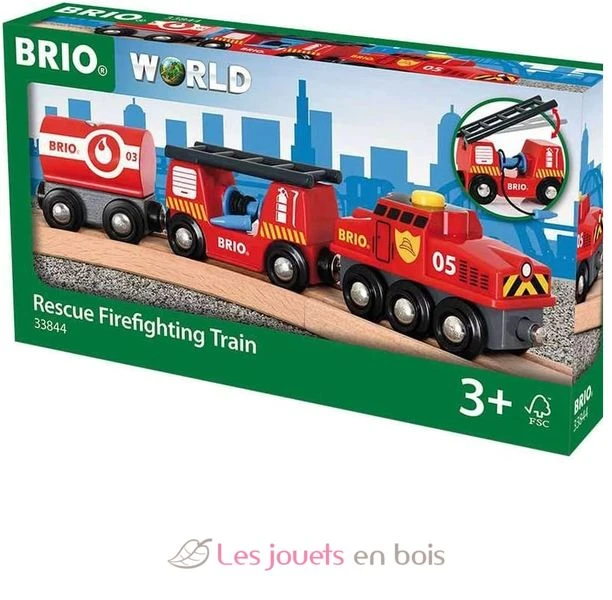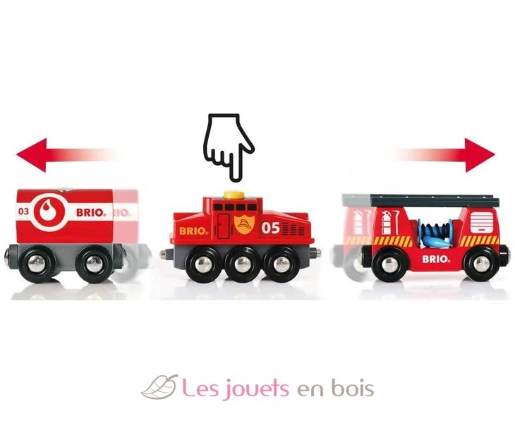 Drücke auf den Knopf auf der Lokomotive, um den Waggon im Notfall schnell abzukoppeln. Fahr nah ans Feuer heran, kopple den Wassertank ab und mach dich mit dem ausziehbaren Feuerwehrschlauch an die Arbeit. BRIO Ref: 33844.