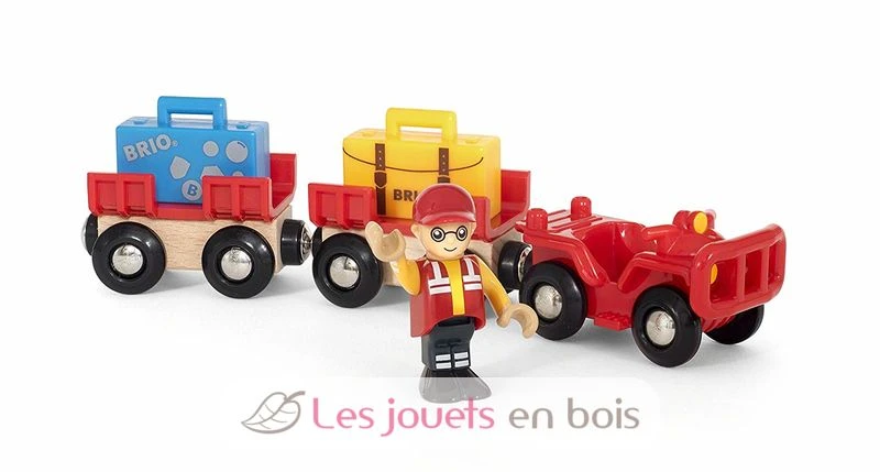 Wenn dieser Gepäckwagen über das Flughafengelände fährt, um die Koffer zu den Flugzeugen zu bringen, ist er einfach nicht zu übersehen. Der BRIO Flughafen-Gepäckwagen enthält einen Arbeiter, einen Geländewagen und zwei Anhänger, auf die jeweils genau ein Koffer passt. Eine ideale Ergänzung für jeden BRIO Flughafen und die komplette BRIO World.