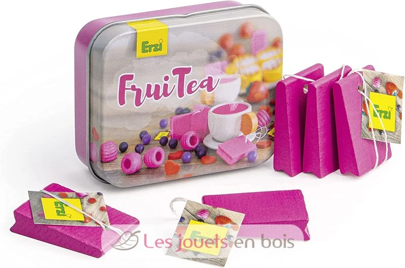 5 bunte Teebeutel aus Holz in einer bunt bedruckten Dose zum Spielen.