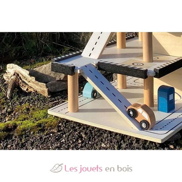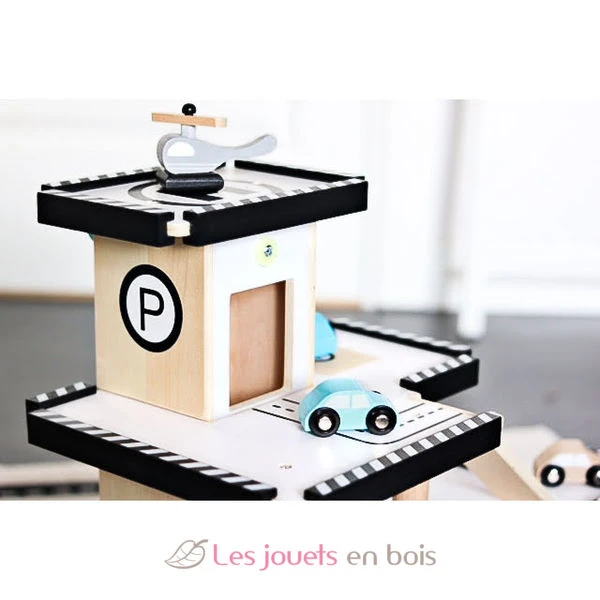 Diese Garage hat 3 Etagen zum Parken von Autos und einen schönen Hubschrauberlandeplatz auf dem Dach. Der Aufzug verfügt über einen Steuerknopf, um die Autos einfach in die verschiedenen Stockwerke zu heben. Diese Holzgarage enthält 3 Autos und 1 Hubschrauber.
