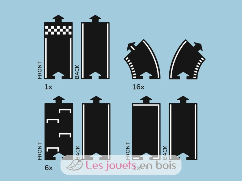 Das 24-teilige Set eignet sich perfekt als Einstieg in die Welt von waytoplay. Es lässt sich jederzeit ganz einfach durch den Zukauf zusätzlicher Sets erweitern. Beinhaltet 12 Kurven und 8 Geraden, beidseitig bedruckt. Sehen Sie Ihren Kindern dabei zu, wie sie für ihre Lieblingsspielzeuge und Autos ihre ganz eigenen Rundkurse und Straßenverläufe bauen !