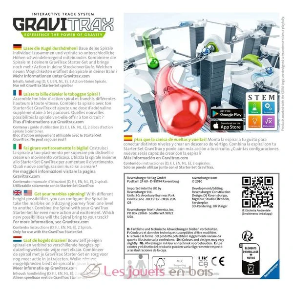 Beleben Sie Ihre GraviTrax-Zirkel mit dieser vollständig modularen Spiralrutsche und lassen Sie Ihre Murmeln die Spirale hinuntergleiten! Du kannst verschiedene Höhen für deine Spirale einstellen und so eine ganz persönliche Kugelbahn bauen! Dieses Element wird mit mindestens einem Starter-Set gespielt und kann dann mit allen GraviTrax-Produkten kombiniert werden.