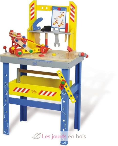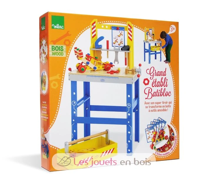 Große Holzbank und Werkzeugkasten. Ein Holz Spiel für kleine Jungs. Es besteht aus 80 Modellen Zubehör plus 5 Blatt. Er ließ für Stunden Bastelei mit dieser neuen Vater als fest XXL. Die Schublade wird zum Cash-Removable-Tool. Dieser Satz ist ein riesiger Holzspielzeug von Vilac Marke