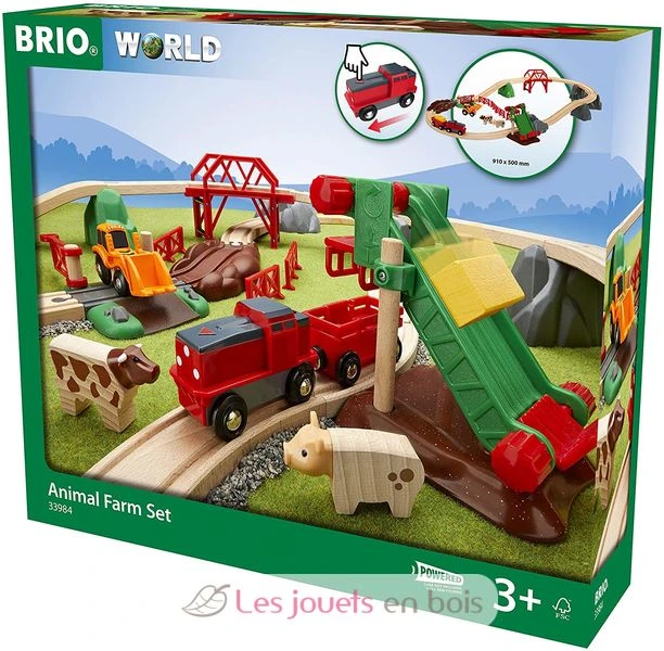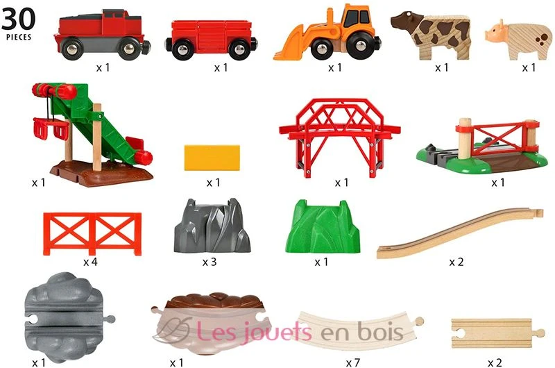 Das Großes BRIO Bahn Bauernhof-Set mit 30 Teilen bringt dich zurück in die Natur, mitten in eine harmonische Bauernhofumgebung. Die batteriebetriebene Güterlok ist unterwegs und bringt den verspielten Tieren ihr Futter. Verlade das Heu von der Heuverladestation auf den Güterwaggon. Dann fahre über die bergige Landschaft, bis du den Bauernhof erreichst, wo der Traktor schon darauf wartet, das Futter zu den Tieren auf die Wiesen zu bringen.