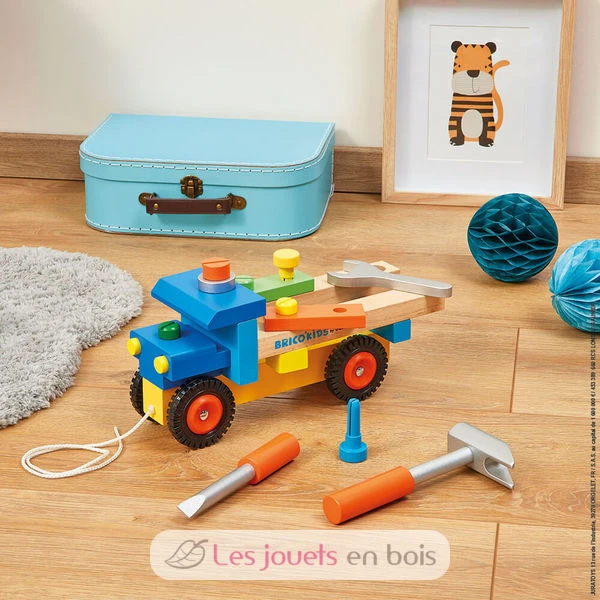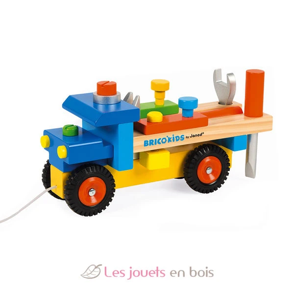 Nizza Lastkraftwagen und hölzernen Werkzeugen. Ein bunter Lastkraftwagen, die Demontage und Montage für Ihre Kinder kleine Heimwerker abspielen zu können. Ein Holzspielzeug Marke Janod.