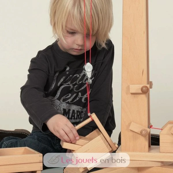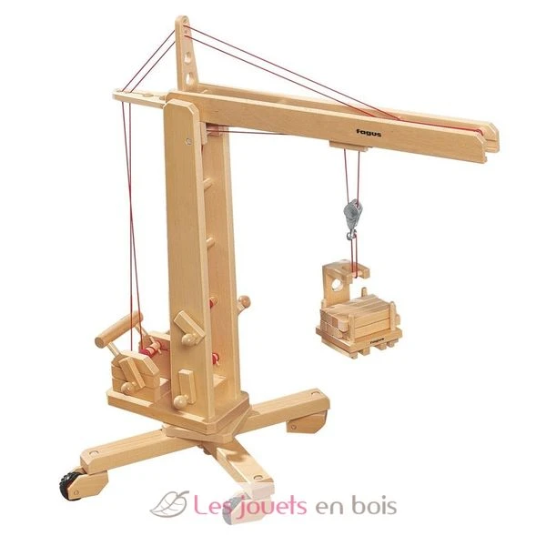 Ein Umdrehungskran aus Holz von fast 1 Meter für die Konstruktion seiner Baustellen. Drehumdrehung an Ladungsgabel 1 zu stapelnde Kiste. Dieses Spielzeug deutscher Herstellung wird willentlich ohne Nägel, Schrauben oder Klammern verwirklicht. Der farblose Lack bewahrt die Struktur und die Hitze des Holzes. Ein Buchenholzspielzeug dauerhaftes und von hoher Qualität des Fagus-Hauses.