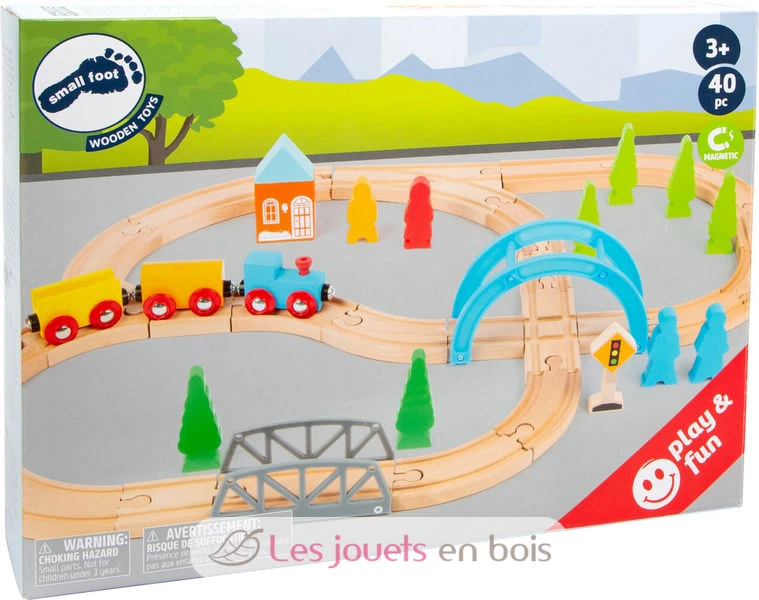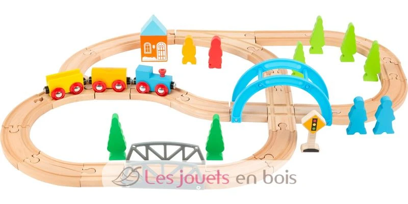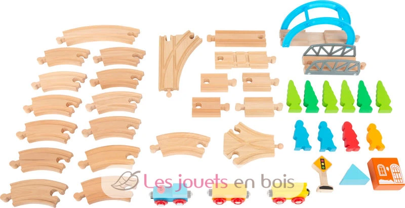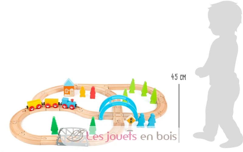 Eine Eisenbahnwelt für kleine Entdecker! Mit diesem Eisenbahn-Set aus Holz inkl. umfangreichem Zubehör-Set kommen kleine Eisenbahner voll auf ihre Kosten. Hier fährt die Eisenbahn über Brücken und durch Täler und schlägt durch die verschiedenen Gleisabzweigungen immer wieder einen neuen Weg ein. Die Holzschienen sind mit allen handelsüblichen Schienen kompatibel.