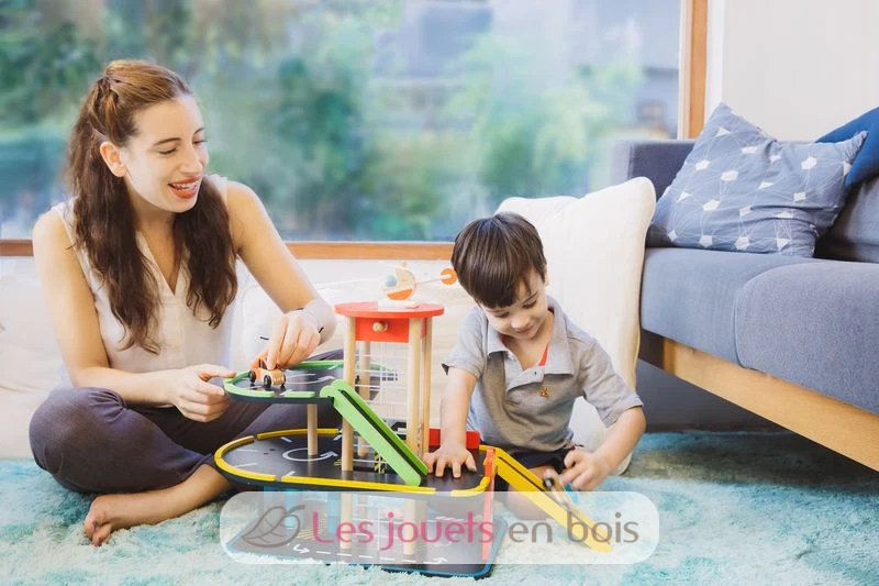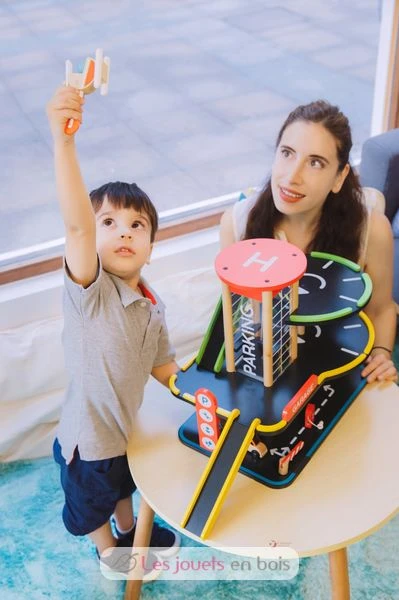 Kinder können auf den verschiedenen Etagen dieser großartigen Garage Spaß beim Autofahren haben, indem sie den auf dem Boden gezeichneten Pfeilen folgen oder den transparenten Aufzug benutzen. Nachdem sie ihr Auto gewaschen und aufgetankt haben, können sie an Bord des Hubschraubers auf Mission gehen. Diese Kindergarage ist mit 2 Autos und einem Holzhubschrauber ausgestattet.
