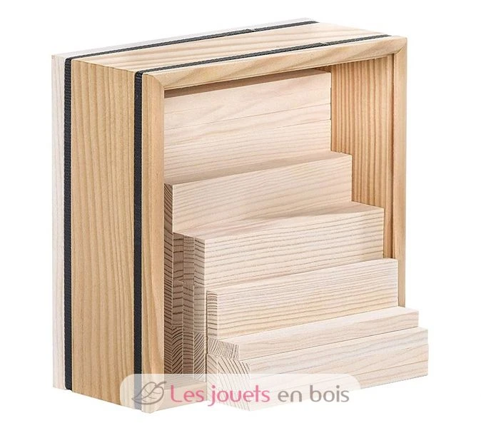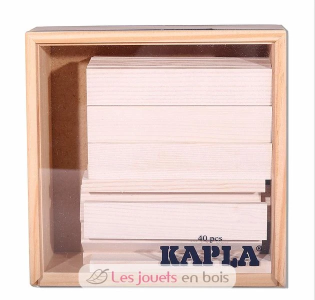 Kapla – Die berühmte 40 gelben Plättchen aus naturbelassenem erstklassigem Pinienholz von den Landes (von verwalteten Wäldern stammt) sind 12 cm lang. Kapla 40er Quadrat erlaubt dem Kind, entweder, diesen Baukasten zu entdecken, oder den Barrel 100 naturbelassene Holzplättchen zu ergänzen. Die Plättchen sind in einer Holzkiste mit transparentem Fenster geliefert, sehr praktisch für das Aufräumen. Altersempfehlung : 3 Jahre.