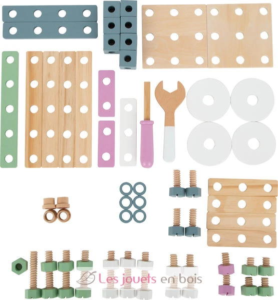 Bauen und Werkeln im nordischen Design! Mit Lochleisten, Gewindewürfeln, Schrauben, Muttern, Holzscheiben und Konstruktionsplatten können kleine Bauingenieure richtig loslegen. Mit Hilfe von Schraubenschlüssel und Schraubendreher werden alle Bauteile fachgerecht montiert. Egal ob Traktor, Lok oder Kran – der Kreativität sind keine Grenzen gesetzt. Mit den selbst konstruierten Modellen lässt sich anschließend toll spielen!