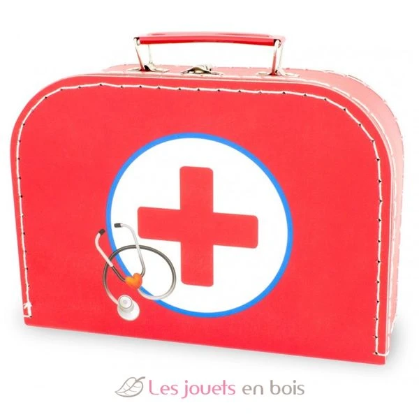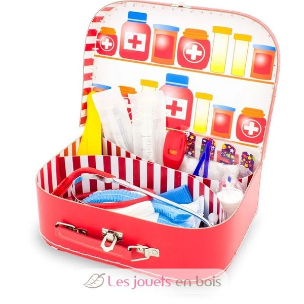 Dieser Karton enthält: 1 Pflegeheft, 1 Stethoskop (funktionell), 2 blaue GM-Elastikmasken, 2 weiße PM-Elastikmasken, 2 Chirurgenkappen, 2 Charlotten, 1 Paar Latexhandschuhe, 2 Zungenspatel gelber Kunststoff, 1 Thermometer (Attrappe) ), 1 blaue anatomische Pinzette, 1 Baumwollbeutel, 1 Rolle „Klebepflaster“, 1 Stretchband (Rolle), 4 farbige Verbände und 2 Spritzen (10 ml und 20 ml).