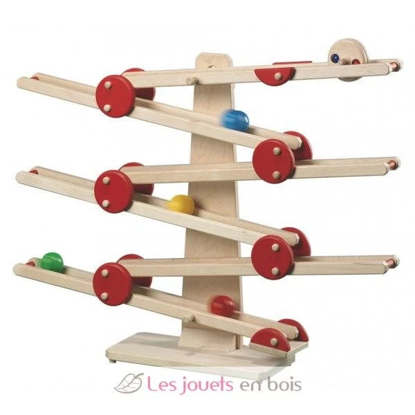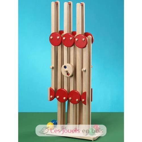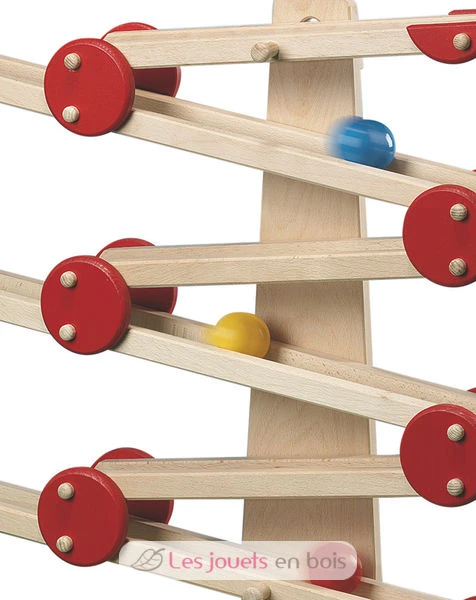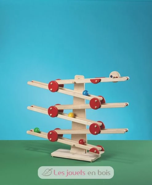 Die Fagus® – 19.01 – Kugelbahn 6-teilig wird Mädchen und Jungen ab 3 Jahren begeistern. Auf der Kugelbahn können die 4 bunten Kugeln und die Glöckchen-Scheibe herunter rollen. Sie werden auf das oberste Brett gelegt und schon fangen sie an, die Bahnen herunter zu rollen. Die 54 cm hohe und 70 cm breite Bahn wurde aus massivem Holz gefertigt, wodurch sie besonders robust wird. Das Made in Germany Spielzeug kann mit einem feuchten Tuch abgewischt werden. Das Holzspielzeug fördert die Feinmotorik Ihres Lieblings sowie die Kreativität und das Zusammenspiel mit Gleichaltrigen. Auch die akustische Wahrnehmung wird durch das Klingeln der Glöckchen-Scheibe beim Herunterrollen unterstützt. Zudem wurde es von spiel gut ausgezeichnet. Großen Spielspaß haben Kinder mit der Fagus® – 19.01 – Kugelbahn 6-teilig.