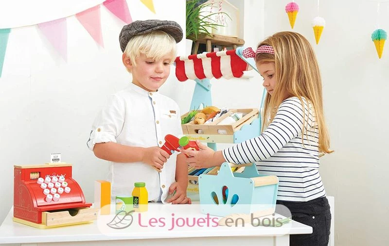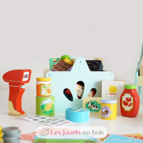 Die Accessoires sind aus massivem Gummibaumholz gefertigt und in attraktiven hellen Farben lackiert. Unter diesen Accessoires, um Kaufmann oder Kaufmann zu spielen, finden Sie eine Dose Thunfisch, Butter, ein Baguette, Kekse, eine Dose Mais, Ketchup, Olivenöl, Spaghetti, Schokolade und Müsli.