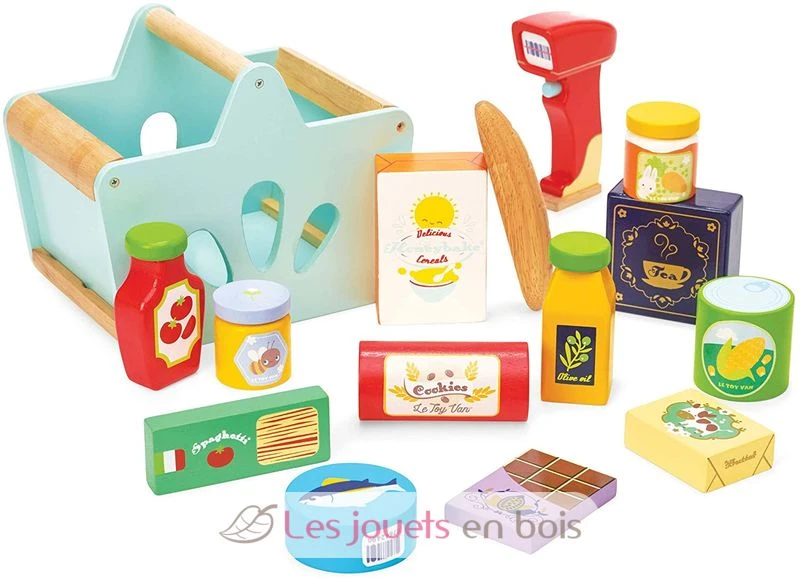 Dieses Set mit Lebensmittelprodukten von Le Toy Van umfasst einen Holzkorb, 13 Lebensmittelzubehörteile, ein Barcode-Lesegerät sowie Barcode-Aufkleber.