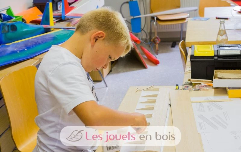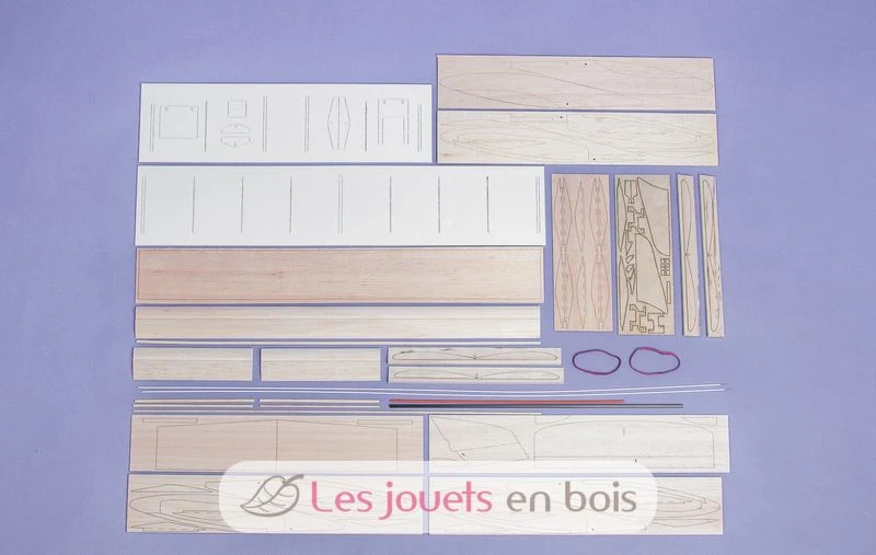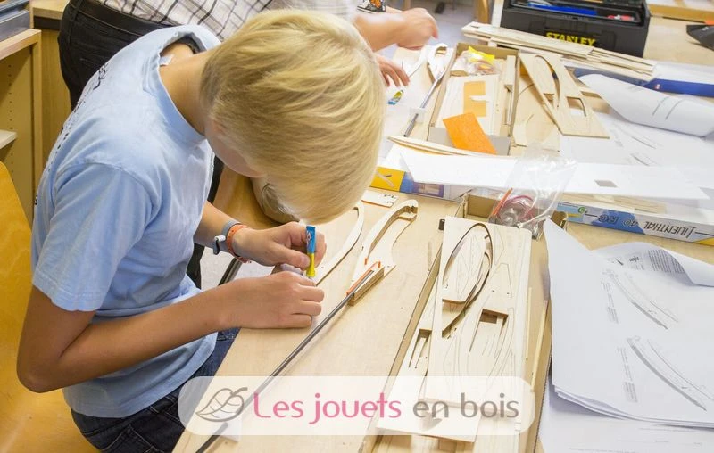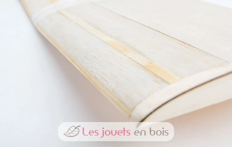 Wie von aero-naut gewohnt sind alle Teile exakt lasergeschnitten. Die Nasenleiste des Modells ist bereits in Form gefräst – hier sind keine Schleifarbeiten nötig. Die Tragfläche wird mit vorgeformten Balsateilen mit Hilfe von Stützrippen zusammengeklebt. Die Ohren der Flächen werden bereits mit der passenden V-Form hergestellt, die dann nicht mehr aufwendig zugeschliffen werden muss.