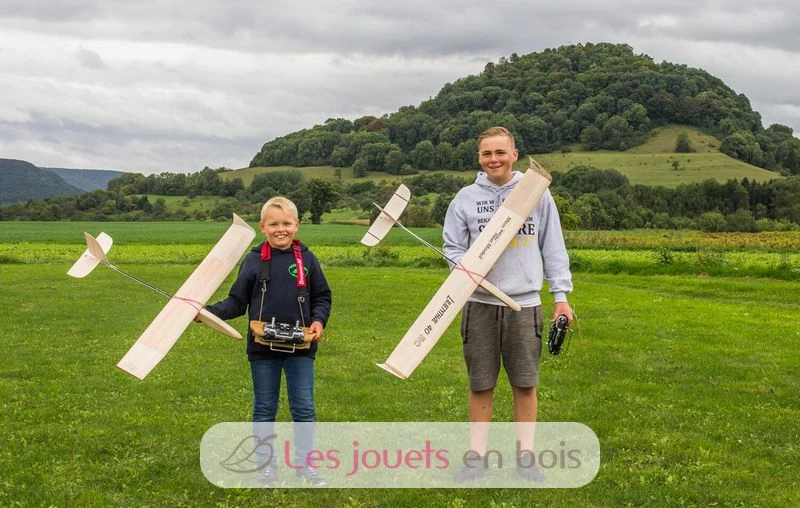 Mit dem Lilienthal 40 RC ist auch der Ausbau mit Fernsteuerung kein Problem mehr. Der Rumpf bietet genug Platz für 2 Micro-Servos, Empfänger und Akku. Ein passendes Servobrett, Anlenkungen und Bowdenzugrohre liegen dem Bausatz bereits bei. Das Modell kann aber auch als reines Freiflugmodell gebaut und die RC-Komponenten zu einem späteren Zeitpunkt nachgerüstet werden. Ein Hochstarthaken ist ebenfalls im Bausatz enthalten.