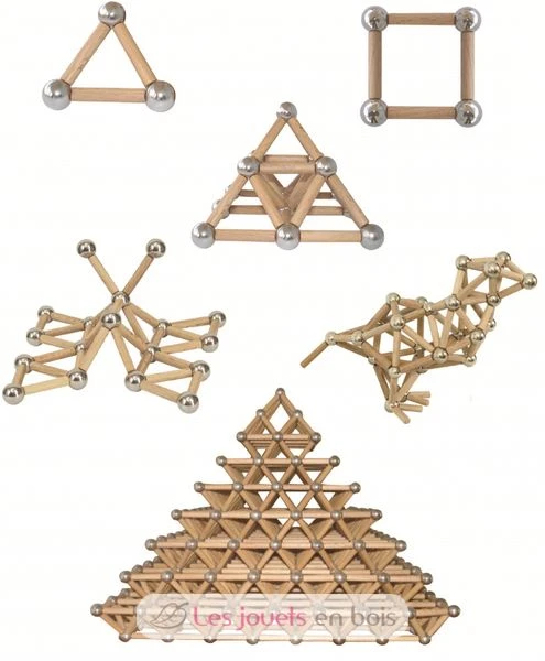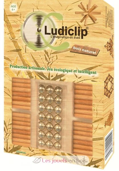 Eine ökologische Bauweise, bestehend aus 53 Teile aus Buche und Stahl. Ideal für das Lernen Formen und Geometrie im Raum. Auch in farbigen Holz. Ab 6 Jahren. Ludiclip Magnetnaturholz, machte eine magnetische Konstruktionsspiel auf traditionelle Weise von Corknoz Gesellschaft. Ref. LB1805