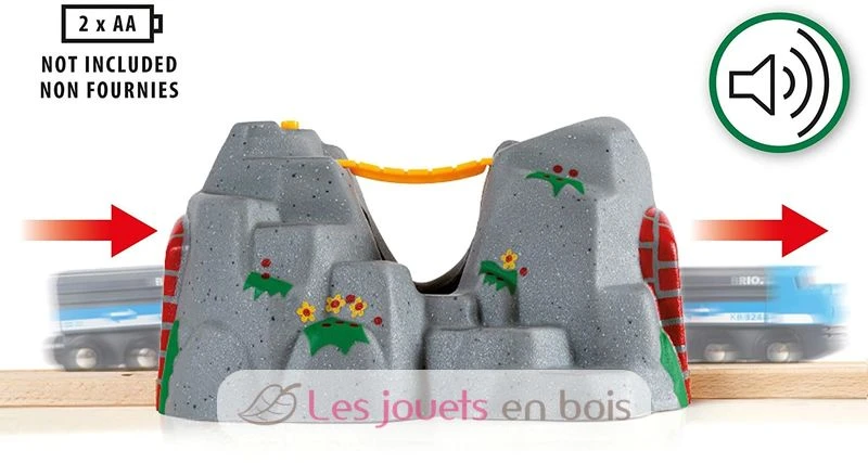 Dieser Tunnel macht 4 verschiedene Töne, wenn der Zug vorbeifährt. Benötigt 2 AA 1.5V Batterien (nicht im Lieferumfang enthalten) BRIO Züge und Schaltungen Ref: 33481