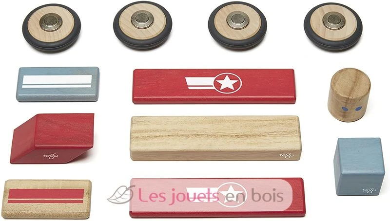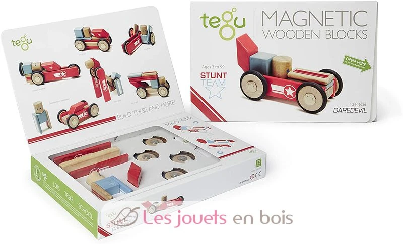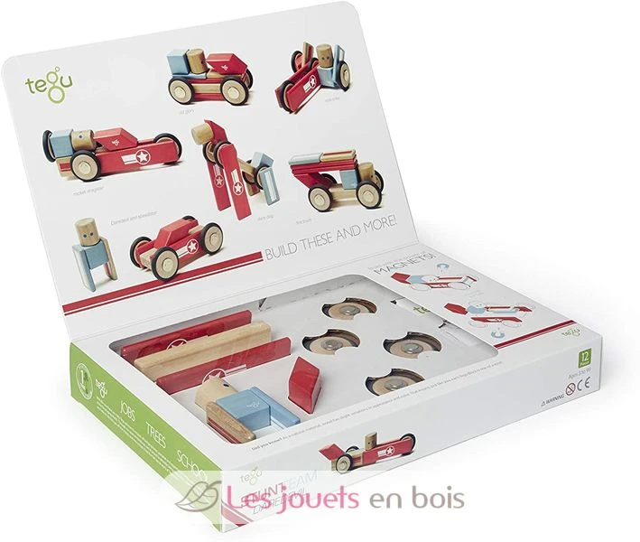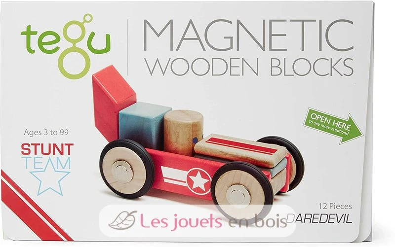 Dieses Set enthält 12 hölzerne Magnetblöcke. Dieses Set aus 12 magnetischen Holzblöcken, die mit kleinen Motiven fein bedruckt sind, gehört zum Stunt Team-Sortiment der Marke Tegu.