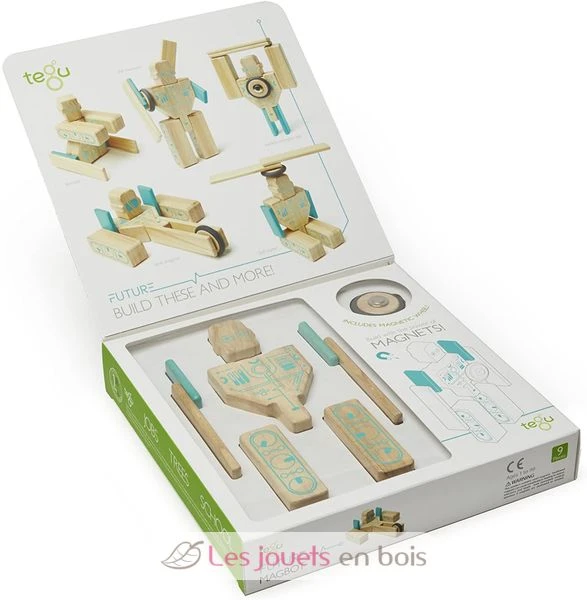 Dieses Set enthält 9 hölzerne Magnetblöcke. Dieses Set aus 9 magnetischen Holzblöcken, die mit kleinen futuristischen Mustern fein bedruckt sind, gehört zur Future-Serie der Marke Tegu.