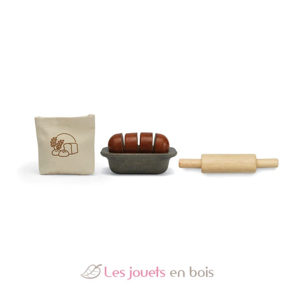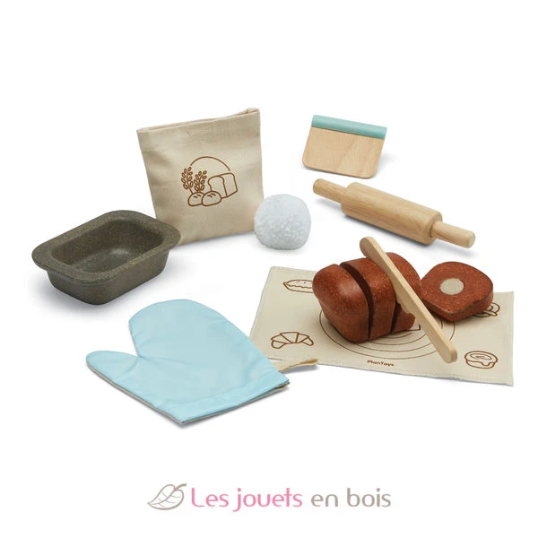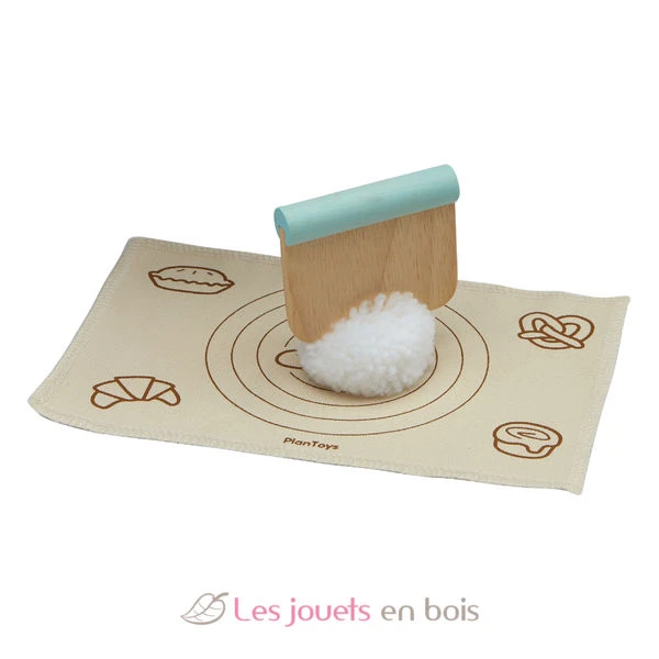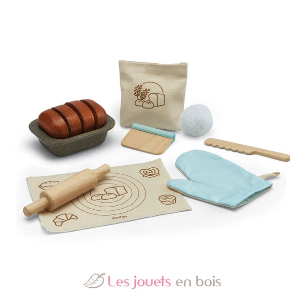 Dieses Bäckerset besteht aus 9 Zubehörteilen: einer Bäckermatte, einem Brot, einem Teigschneider (Gebäckhorn), einer Form, einer Gebäckrolle, einem Zahnmesser, einer Tüte Mehl und einem Topflappen.