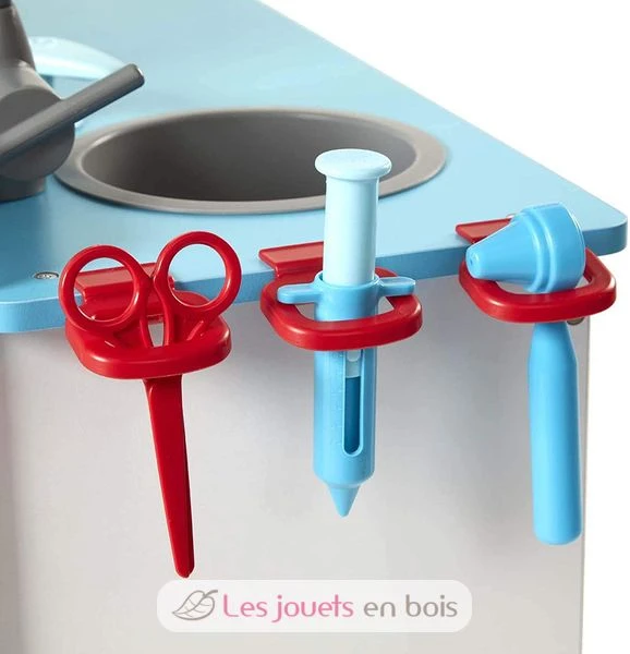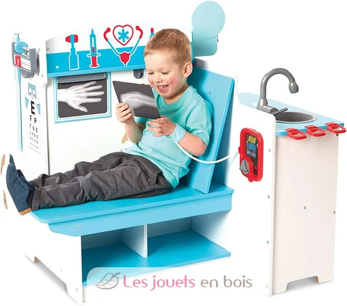 Mehrseitiges Arztpraxis-Spielzentrum aus Holz mit Wartebereich, Untersuchungsraum, Waschbecken und Empfangsbereich