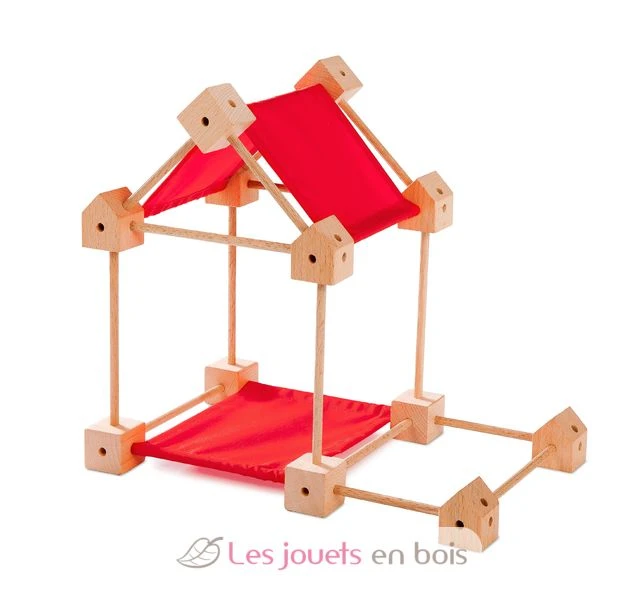 Inhalt : 6 Vierkantklötzchen / 6 Winkelklötzchen / 28 Leisten (2 Längen) / 2 Stoffstücke / 1 Haus-Box aus Hartpappe.