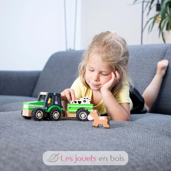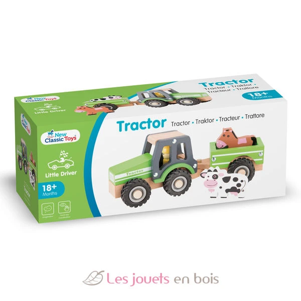Traktor mit anhänger und tieren, ein Holzspielzeug der Marke New Classic Toys. Referenz 11941.