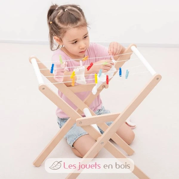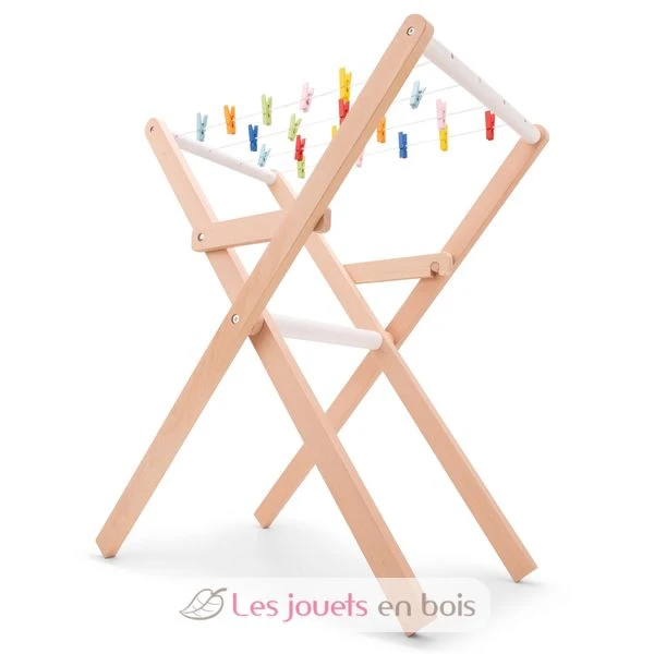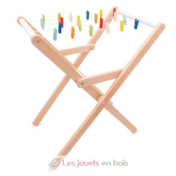 Wird komplett mit 21 bunten Wäscheklammern und 4 Wäscheleinen zum Aufhängen der Wäsche zum Trocknen geliefert. Der Wäscheständer ist zur einfachen Aufbewahrung zusammenklappbar. Er hat die ideale Höhe für Kinder zum Spielen und der Rahmen des Wäscheständers ist aus Buchenholz gefertigt.