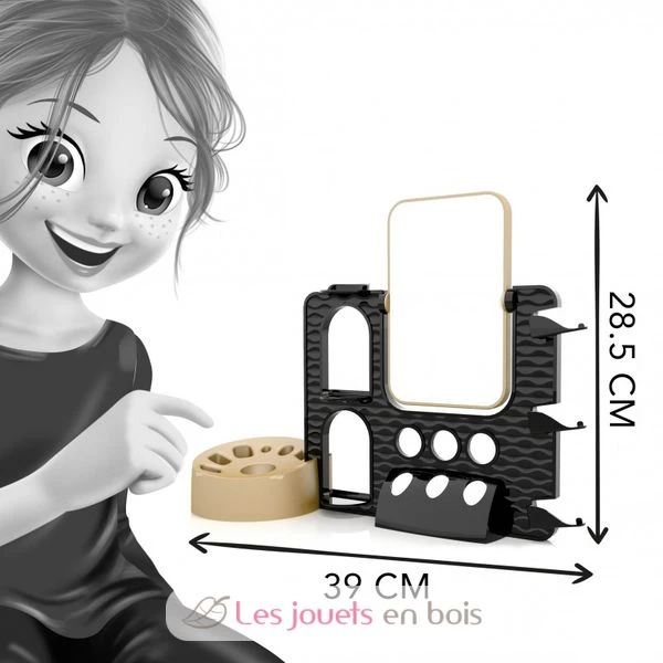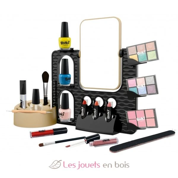 1 Spiegel und viel Stauraum zum Aufstellen der gesamten Ausrüstung: 4 Nagellacke, 2 Lidschattenpaletten, 1 Rougepalette, 3 Lippenstifte, 3 Glosse, 1 Nagelfeile, 2 Bürsten, 3 Nagelhautschieber, 1 Nagelwerkzeug zum Punktieren.