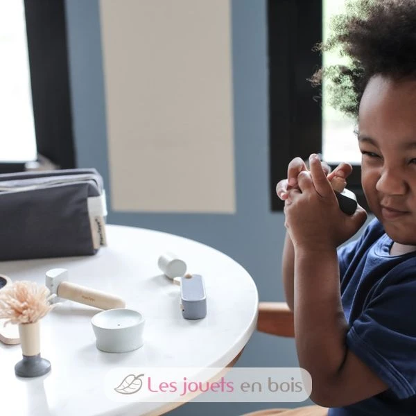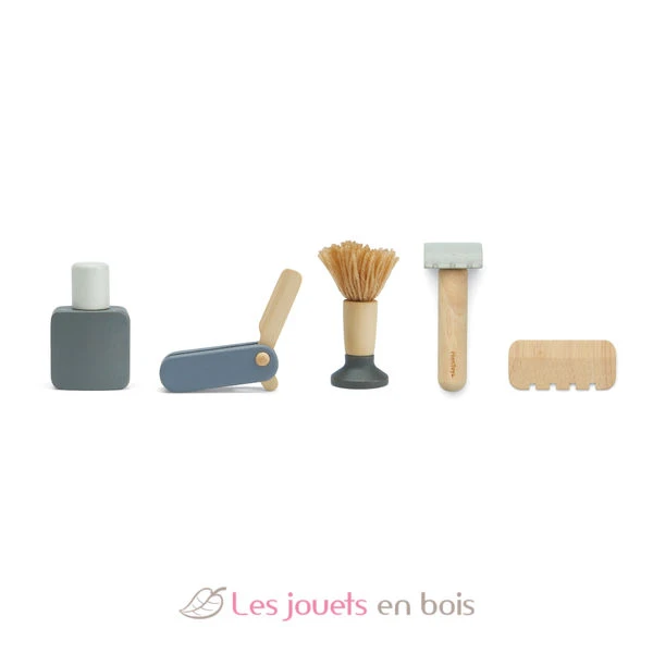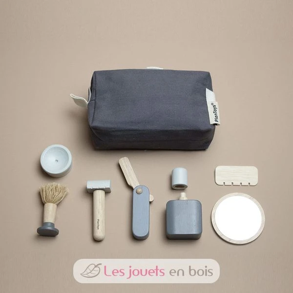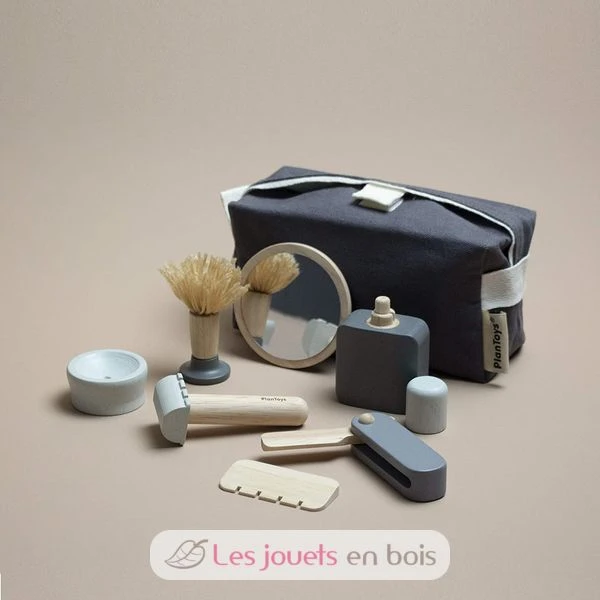 Mein Rasierset enthält einen Kulturbeutel mit 7 Holzaccessoires: einen klassischen Rasierer, einen Friseur, einen Spiegel, einen Bartkamm, ein Aftershave, einen Rasierpinsel und eine Tasse.