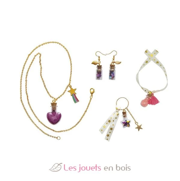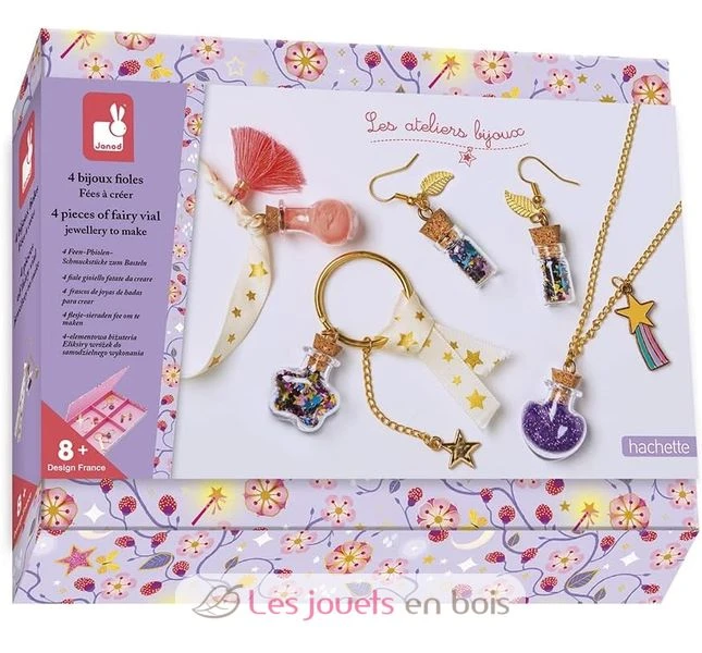 Entdecken Sie das Kreativ-Set Set Ketten 4 Anhänger-Fläschchen Feen von Janod, eine kreative Aktivität für Kinder ab 8 Jahren.