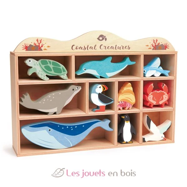 Dieses Set von Meerestieren aus Holz ist ideal, um Ihrem Kleinen die verschiedenen Meerestieren vorzustellen. Es enthält: Holzregal, Meeresschildkröte, Delfin, Fliegender Fisch, Robbe, Papageientaucher, Einsiedlerkrebs, Krabbe, Wal, Pinguin, Möwe