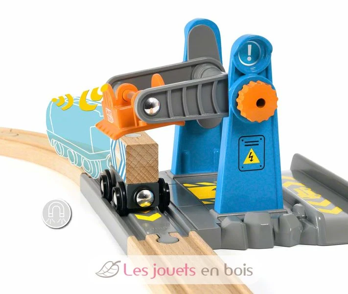 Smart Tech Verladekran von Brio World. Dank der Smart-Tech-Technologie können Kran und Portal mit der Smart Lokomotive (separat erhältlich) kommunizieren und den Spaßaspekt verbessern, indem sie Sound- und Lichteffekte enthüllen.