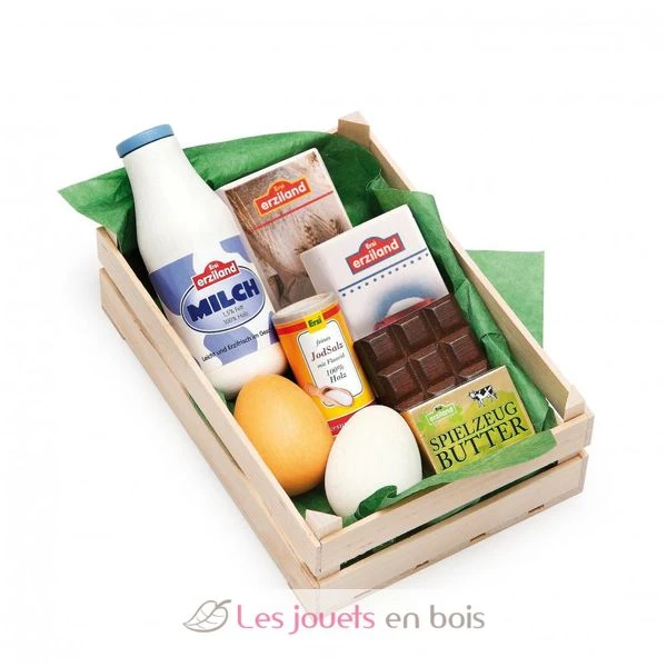 In der Stiege befinden sich folgende, aus farbig lackiertem Holz hergestellte Backzutaten: 1 Milchflasche, 1 Weizenmehl, 1 Zucker, 1 braunes und 1 weißes Ei, 1 Salz, 1 Mini-Schokolade, 1 Butter.