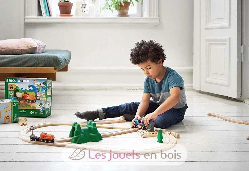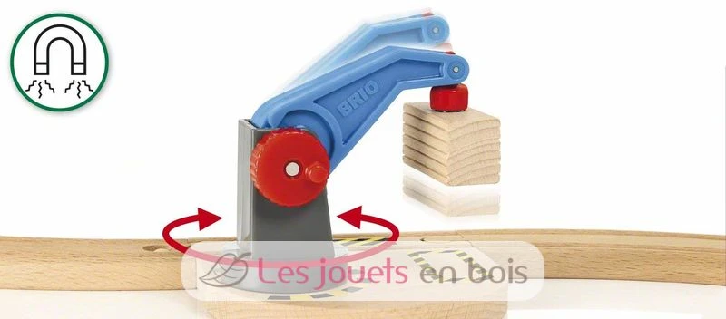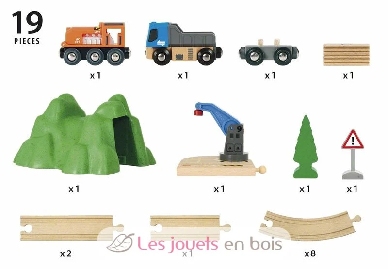 Hochziehen und abladen! Baue und erweitere deine BRIO World mit diesem Starterset Güterzug mit Kran. Das Set ist vollgepackt mit Maschinen – einem Verladekran, einem Lastwagen, einer Lok mit Klappe und einem Anhänger mit Ladung. Auch ein Warnsignal, ein Baum und ein kleiner Berg, durch den du mit der Bahn rasen kannst, fehlen nicht. Hebe die Ladung mit dem Kran vom Lastwagen, drehe den Kran und lade die Ladung auf dem Waggon ab. Passt ausgezeichnet zu allen Produkten der BRIO World.